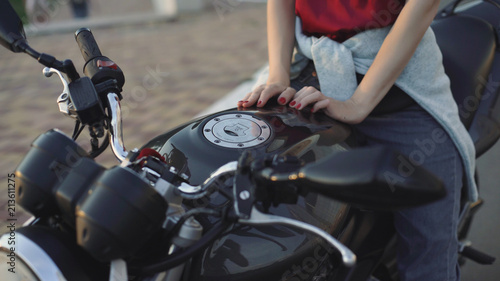 © tol_u4f, Fototapeta premium beautiful young red-haired woman motorcyclist with black motorcycle helmet