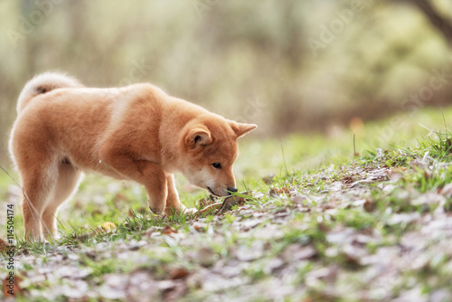 © brusnikaphoto, Naklejka premium Beautiful Young Red Shiba Inu Puppy Dog