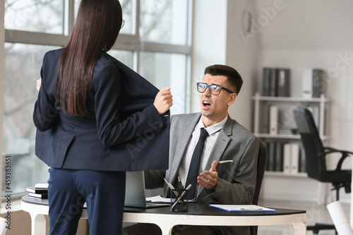 © Pixel-Shot, Fototapeta premium Beautiful young secretary seducing her boss in office. Concept of harassment