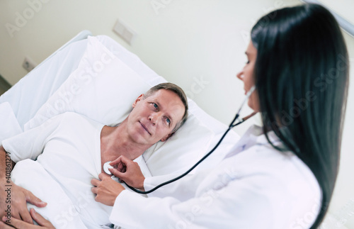 © My Ocean studio, Fototapeta premium Beautiful young smiling confident woman doctor with a stethoscope is examining the senior patient in the hospital ward