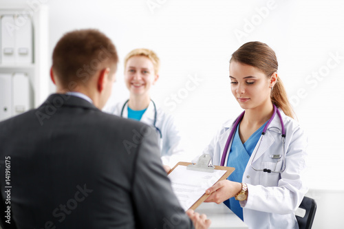 © lenets_tan, Fototapeta premium Beautiful young smiling female doctor sitting at the desk