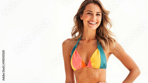 © BloomPix, Naklejka premium Beautiful young smiling woman model brunette with a beautiful slim figure in a swimsuit posing on a white background. Healthy lifestyle, healthy body and beauty