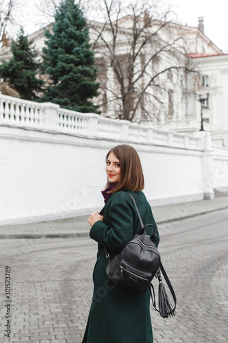 © NesolenayaAleksandra, Fototapeta premium Beautiful young stylish brunette woman wearing midi green coat, black backpack, purple scarf walking through the city street. Trendy casual outfit. Street fashion. Everyday winter, autumn, spring look