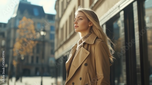 © Johannes, Fototapeta premium Beautiful Young Stylish Girl in Trench Coat Walking Autumn or Spring street. Autumn outdoor fashion.
