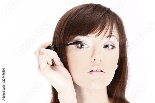 Obraz premium Beautiful young woman applying cosmetic paint brush