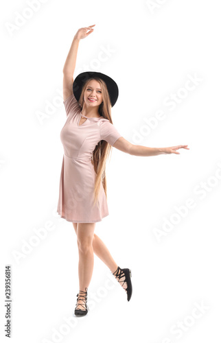 © Pixel-Shot, Obraz premium Beautiful young woman dancing on white background