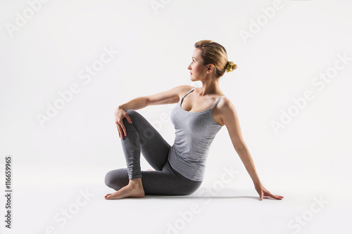 Fototapeta premium Beautiful young woman doing yoga. Isolated on white