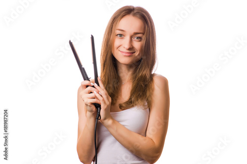 Fototapeta premium Beautiful young woman hair ironing