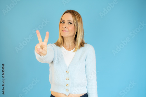 © Danko, Fototapeta premium Beautiful young woman happy and excited expressing winning gesture. Successful pretty woman celebrating victory, triumphant, studio shot over blue background