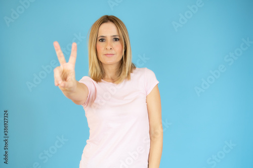 © Danko, Fototapeta premium Beautiful young woman happy and excited expressing winning gesture. Successful pretty woman celebrating victory, triumphant, studio shot over blue background