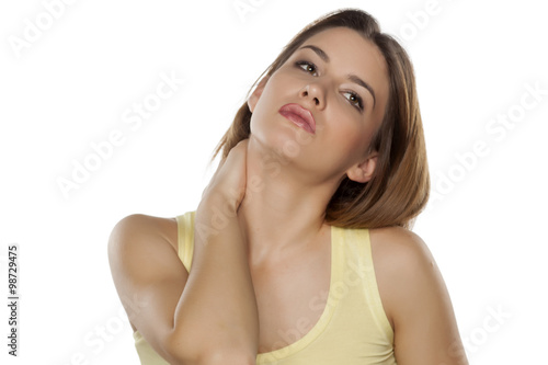 Fototapeta premium beautiful young woman has pain in the neck