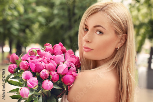 © Africa Studio, Fototapeta premium Beautiful young woman holding bouquet with beautiful peonies on street