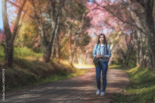 © Songsak C, Fototapeta premium beautiful young woman holding travel camera on cherry blossom blur background