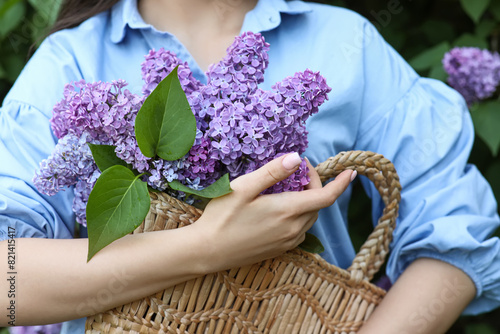Obraz premium Beautiful young woman holding wicker bag with bouquet of lilac flowers in park on spring day, closeup
