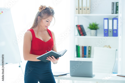 Fototapeta premium Beautiful young woman in a red top and pants in the office holds a business notebook in her hands