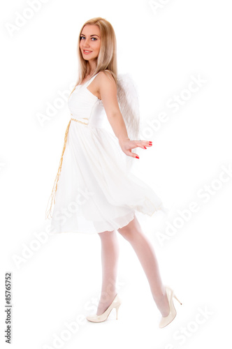 Naklejka premium Beautiful young woman in a white dress with angel wings