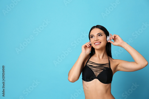 Fototapeta premium Beautiful young woman in black bikini with headphones on light blue...