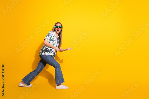 © deagreez, Fototapeta premium Beautiful young woman in casual tropical print shirt posing confidently on bright yellow background with cheerful smile