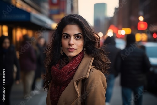 © Stocknterias, Fototapeta premium Beautiful young woman in New York City at night, wearing brown coat and scarf.