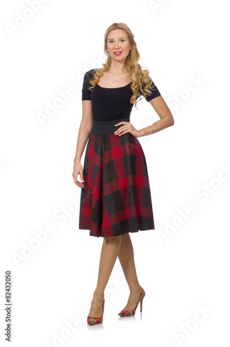 Fototapeta premium Beautiful young woman in plaid dress isolated on white