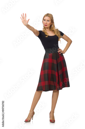 Fototapeta premium Beautiful young woman in plaid dress isolated on white