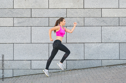 Fototapeta premium Beautiful young woman in sports clothing running while exercising outdoors.