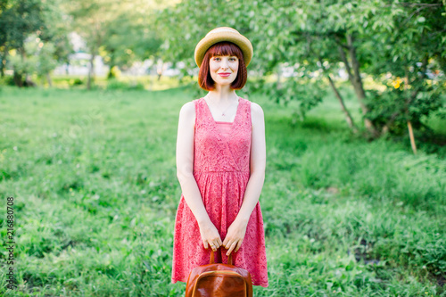 © sofiko14, Obraz premium beautiful young woman in the garden. A girl in a straw hat. Portrait of a girl in a crimson dress smiles