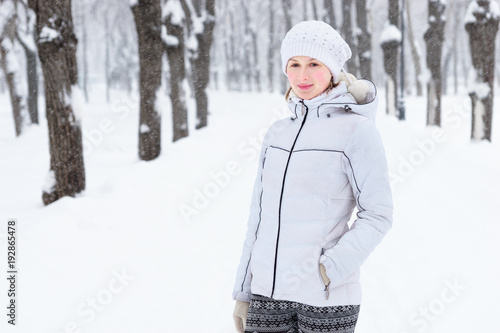 © Sloniki, Obraz premium Beautiful young woman in the snow in winter