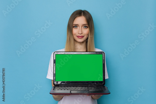 © studioloco, Naklejka premium Beautiful Young Woman Is Holding Laptop With Green Screen.