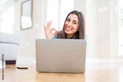 Fototapeta premium Beautiful young woman laying on the floor using laptop doing ok sign with...