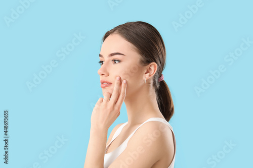 Fototapeta premium Beautiful young woman massaging her face on color background