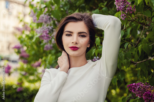 Fototapeta premium Beautiful young woman model brunette with lilac flowers