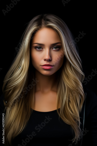 © Nikname, Fototapeta premium Beautiful young woman, modern with makeup, in a black top and a black leather jacket.
