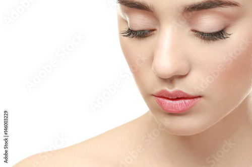 Obraz premium Beautiful young woman on white background, closeup