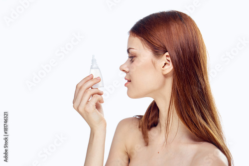 Fototapeta premium Beautiful young woman on white isolated background holds drops, pharmacy, medicine
