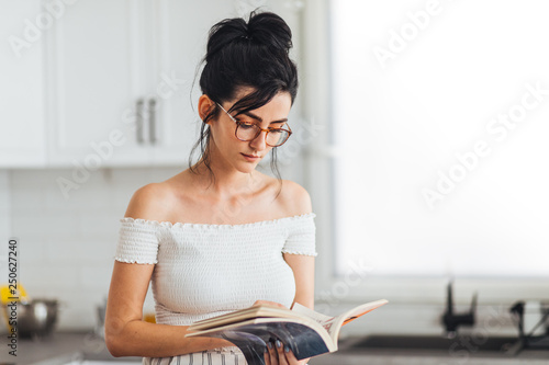 Obraz premium Beautiful young woman reading magazine in her apartment