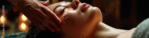 © Ketanoff, Fototapeta premium Beautiful young woman receiving massage in spa salon. AI generated.