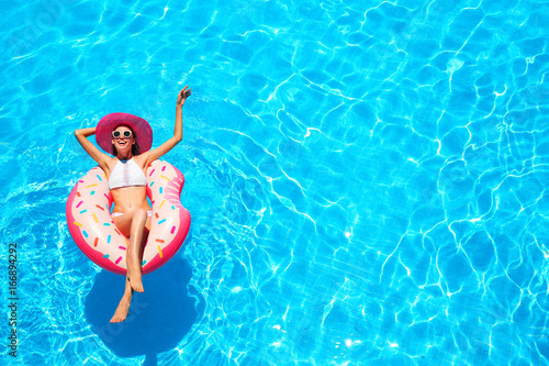Obraz premium Beautiful young woman relaxing on inflatable donut in blue swimming pool