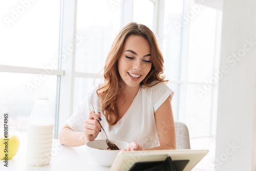 Obraz premium Beautiful young woman sitting at the kitchen near window