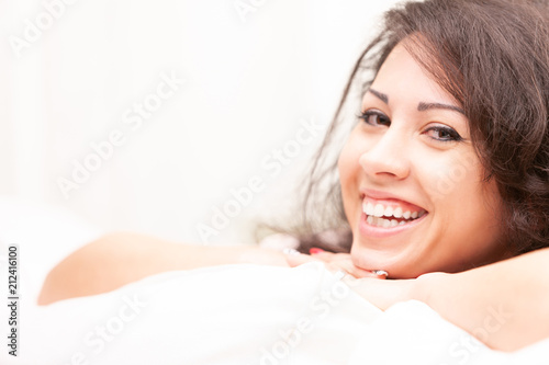 © Giulio_Fornasar, Fototapeta premium beautiful young woman smiling on her sofa