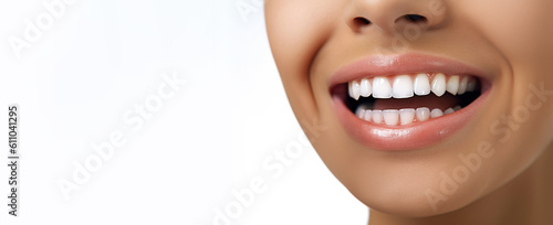 Obraz premium Beautiful young woman teeth close up with copy space on the left side. Generative ai