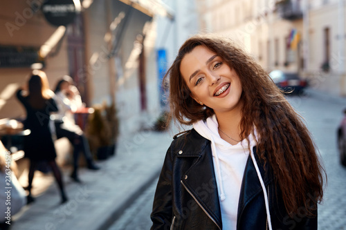 © vitaliymateha, Fototapeta premium beautiful young woman walking city having fun. joyful Woman with long curly hair, wearing in black leather biker jacket and white hoodie standing on the street and smiling
