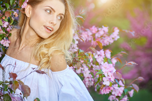 Fototapeta premium Beautiful young woman walking near the blossoming spring tree.