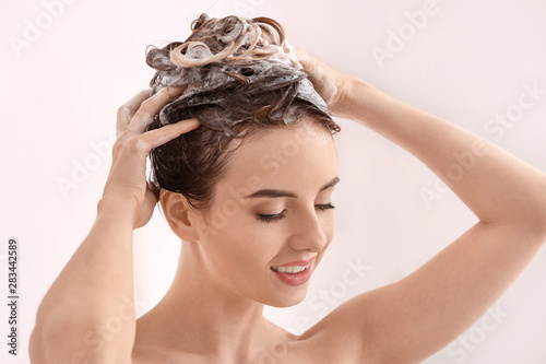 © Pixel-Shot, Naklejka premium Beautiful young woman washing hair in shower