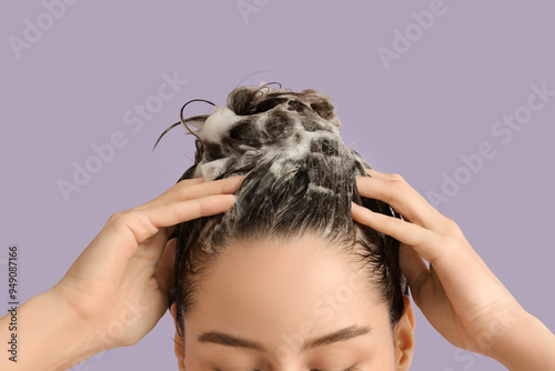 Fototapeta premium Beautiful young woman washing her hair with shampoo on purple background,...