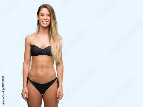 © Krakenimages.com, Naklejka premium Beautiful young woman wearing black bikini with a happy face standing and smiling with a confident smile showing teeth