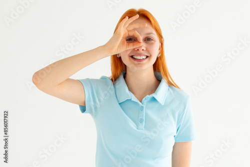 © Яна Солодкая, Fototapeta premium Beautiful young woman wearing casual blue t-shirt doing ok gesture with hand smiling, eye looking through fingers with happy face.
