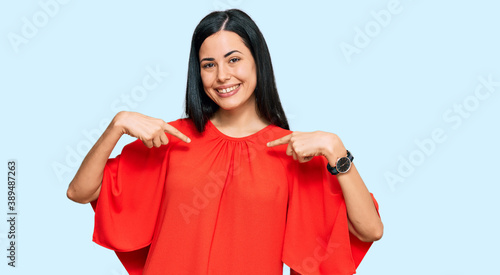 Fototapeta premium Beautiful young woman wearing casual clothes looking confident with smile on face, pointing oneself with fingers proud and happy.