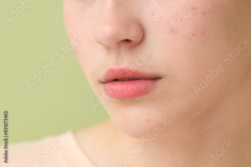Obraz premium Beautiful young woman with acne problem on green background, closeup