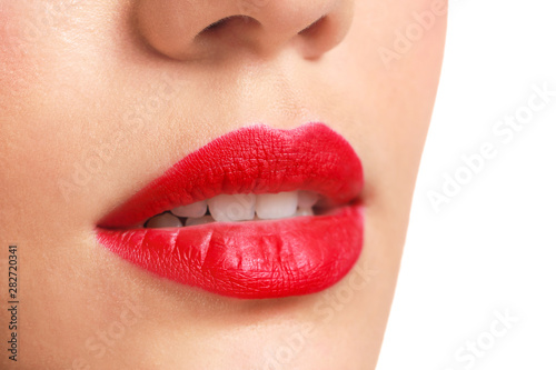 Obraz premium Beautiful young woman with bright lipstick, closeup